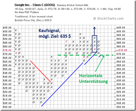 Abb: Google in PnF, traditionelle Chartcraft Methode, Unterstützung 570 USD