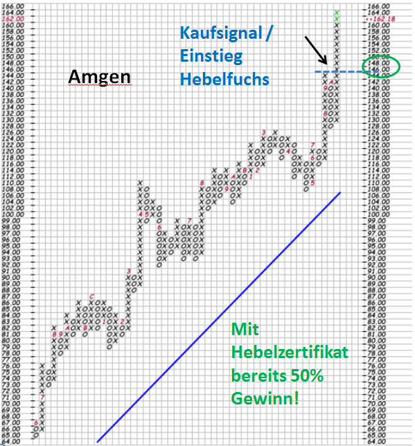 Vor einer Woche empfahl ich meinen Lesern von Hebelfuchs Amgen zum Kauf. Inzwischen ist die Position mit knapp 60% im Gewinn. Heute empfahl ich den Lesern, den Stoploss entsprechend anzupassen und somit 50% Gewinn abzusichern!