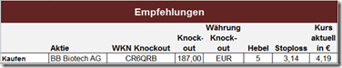 Der Kurs von BB Biotech notiert aktuell bei 244 €, das Zertifikat weist einen Buchgewinn von sage und schreibe 83% auf. Und das in gut zwei Wochen!