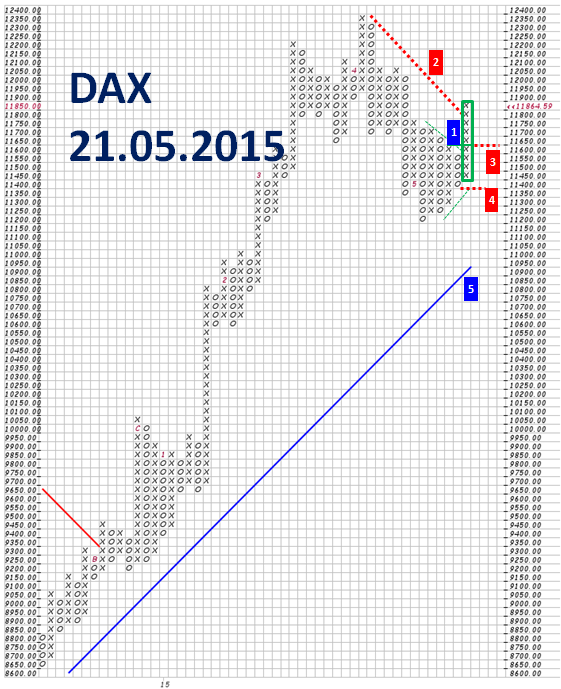Sowohl eine horizontale Unterstützung als auch eine Dreiecks-Unterstützung liegt bei 11.400 Punkten (4). Diese Kreuz-Unterstützung sollte sehr stabil sein. Die langfristige Hausse-Unterstützung liegt inzwischen bei 10.950 Punkten (5). Ein Short-Signal würde bei Unterschreiten der letzten O-Säule gebildet werden, d.h. bei Kursen unterhalb von 11.350 Punkten.