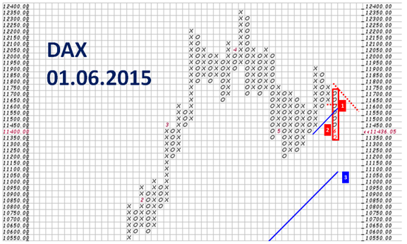 Die Kurse sind tatsächlich weiter nach unten durchgesackt. Die vorherige O-Säule wurde nach unten durchbrochen, die kurzfristige Aufwärtstrendlinie wurde ebenfalls durchschritten (2) . Somit ein neues Verkaufssignal gebildet (1) . Allerdings ist dies ein mittelfristiges Verkaufssignal, denn die Kurse sind noch oberhalb der langjährigen Hausse-Unterstützung, die inzwischen bei 11.100 Punkten verläuft (3).