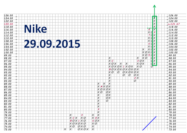 Abb: Point & Figure Chart Nike, 2 Punkte Boxsize, 3 Reversal