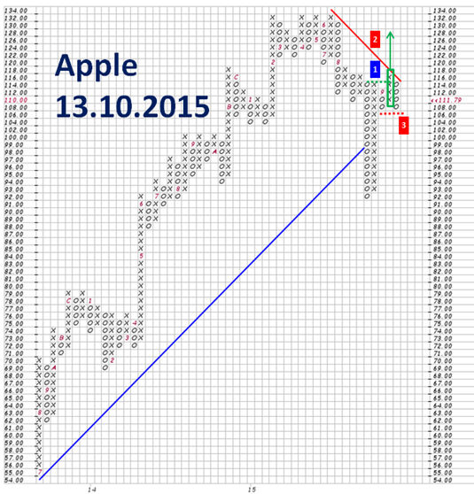Abb: Point & Figure Chart Apple, 2$ Boxsize, 3 Reversal, Quelle: stockcharts.com und eigene Anmerkungen